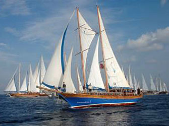 ![]() Und sie segeln doch! 17.10.2014 Viele Yachties schauen noch immer etwas auf die Gulets herab, die manche nur als motorsegelnde Partyschiffe verunglimpfen. Dass die großen Holzschiffe aber auch richtig gut segeln, kann man sich beim "Bodrum Cup" an diesem Wochenende anschauen. Knapp 30 Schiffe gehen dort diesmal an den Start und es wird, trotz teils zahlender Gäste an Bord, "richtig" Regatta gesegelt. Die Schiffe haben entsprechende Segelfläche, nicht wie einige der winzigen, besseren Deko-Lappen einiger Motor-Gulets. Stattdessen zwei Vorsegel, vielerorts sogar riesige, knallbunte Blister. Wer die hölzernen Riesen mal richtig sportlich erleben will, schaut sich den Start vor Bodrum am 21.10. um 11 Uhr an.