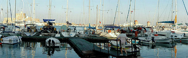 Selten Platz auf Rhodos ... 17.09.2009 ![]() Mandraki, der alte Hafen von Rhodos, war schon vor 20 Jahren überbelegt. Allerdings war es damals noch möglich in Dreierreihen voreinander festzumachen Anker im Hafenschlick, Leine zur Windmühlenpier. Dass es dabei regelmäßig zu zeitaufwändigen Ankersalat-Manövern kam, nahm man in Kauf. Außerdem konnte man bei Überfüllung östlich vor der Mühlenpier mit Buganker und langen Leinen zu den Molensteinen festmachen (was heute wegen der Fährschiffe streng verboten ist). Seit an der Windmühlenpier Murings ausgelegt sind ist es mit den Dreierreihen auch vorbei. Die Gefahr, dass sich Anker in den Muringketten vertörnen wäre zu groß. Darüberhinaus wurde fast die gesamte Pier von Charterfirmen belegt. An Wochenenden, wenn die Crewwechsel stattfinden, ist da noch nicht mal Platz für ein Minikajak. Allenfalls während der Woche zwischen Montag und Freitagmorgen kann man einen Liegeplatz ergattern. Mit viel Glück... Wir kamen diesen Sommer einmal im August und fanden natürlich auch an der Westseite des Hafens, da wo die wenigen Gästeliegeplätze sind, keinen Platz. Vorübergehend machten wir an der vorspringenden Beton-Fährpier fest, um wenigstens Wasser aufnehmen zu können - dort gibt es einen Wasserkasten mit langem Schlauch. Und dann kam die große Überraschung: Vom Fährfahrkartenverkäufer, der vorne auf der Pier auf seinem Stuhl saß, erfuhren wir, dass der rasende Schnellkatamaran, der die Inseln des Dodekanes abfährt und hier anlegt, erst am nächsten Morgen gegen 9 Uhr von Kos her käme. "You can stay for the night!" grinste er und wir hatten den besten Liegeplatz des Hafens.