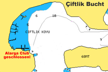 Mit den Steganlangen von "Mehmets Place", "Azmak", "Deniz" und "Rafet Baba" gibt es in der Bucht genügend Alternativen zum Anlegen. Wenn man in einem der angeschlossenen Restaurants zum Essen geht, ist das Liegen am jeweiligen Steg kostenlos. Eines sollte man allerdings beachten, wenn man an den Stegen in Çiftlik festmacht: Bei Südostwind ist der Platz völlig ungeeignet. Im Herbst 2003 scheiterten hier zwei Yachten, deren Skipper die Sturmwarnungen nicht ernst genommen und den Alarga-Steg nicht rechtzeitig verlassen hatten. Der Wind kam in Sturmstärke aus Südost. Das Ergebnis der Verwüstung kann auf dem rechten Bild besichtigt werden. Ort des Desasters: der Strand neben dem damaligen Fanya Club, später Alarga Club. Charterer, die die Küste nicht kennen, möge dieses Bild eine Warnung sein. Im Frühjahr und Herbst sind die Übergangsstürme aus Südost - Lodos genannt - schon mancher Yacht zum Verhängnis geworden. Siehe dazu auch: klick