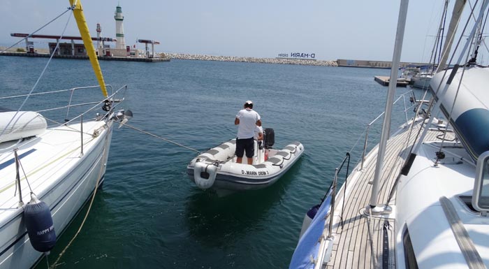 Diesen tollen Service der Marineros erlebte ich zum ersten Mal vor 6 Jahren bei Ansteuerung der ECE Saray Marina in Fethiye. Ich war zunächst dankbar für das Geleit des Dinghis zu unserem freien Anlegeplatz und dann fast erschrocken, als einer der Marineros mit viel Geschick vom Bugkorb aus das Boot enterte und die Mooringleine befestigte. Diese Hilfe durfte ich dort auch in diesem Jahr als Einhandsegler dankbar annehmen.