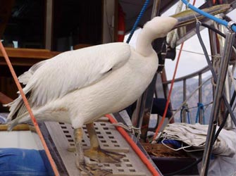 Nachtrag vom 15.1.10: Gestern Abend, Mittwoch, haben die Leute hier den Pelikan "Peli" vom Katamaran runtergeholt - mutig, mutig -, ihn in ein Auto verfrachtet und nach Orhaniye in die Marti Marina gefahren! Dort hat er sich wohl ein leckeres Abendessen servieren lassen und pünktlich zum Frühstück heute Morgen saß er hier wieder auf dem Katamaran. Es gefällt ihm hier wohl besser. Mal sehen, was die Zukunft bringt.