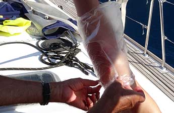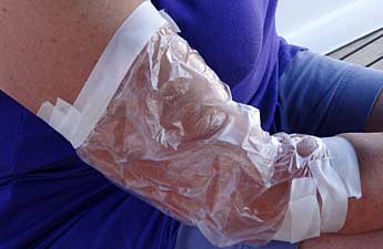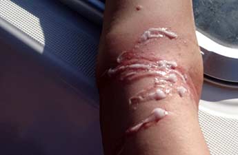 Therapie: Sofort Essig auf die Berührungsstellen tröpfeln, auch Alkohol. Notfalls auch Salzwasser. Keine Waschung mit Süßwasser (!), denn dieses aktiviert sofort die "Explosion" der aufgebrachten Nesselkapseln der Qualle!!! Danach Salbenbehandlung (Fenistil-Gel oder ähnliche antiallergische Gels). Das Auflegen einer kalten Bier- oder Coladose kann den Juckreiz kurzfristig lindern. Ammoniaktinktur soll ebenfalls gut helfen. Weitere Behandlung mit Kortison-Salbe (z.B. Ecural). Auch ein Occlusiv-Verband (= Plastiktüte über die befallenen Stellen ziehen und diese an beiden Enden mit Klebestreifen luftdicht "zu" machen; siehe Bilder oben). Die entzündeten Stellen müssen vorher mit Kortison-Salbe bestrichenen werden. Nach etwa drei Stunden kann der Verband abgenommen werden. Erfahrungsgemäß haben sich dann in Folge der Salbeneinwirkung unter verstärkten Bedingungen Rötung und Schwellung sichtbar zurück gebildet. Als allgemeine Therapie gegen die allergischen Phänomene ist die Gabe von Antihistaminika, seltener Kortison-Tabletten zu erwägen. Insbesondere bei Nacht, wenn der Juckreiz als besonders störend empfunden wird, ist dies sehr hilfreich.