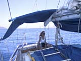 Dieser Bericht einer abenteuerlichen Fahrt in den Gökovagolf stammt von Günter und Ute, die gemeinsam den Versuch wagten, mit einem Schiff, das mehr das machte, was es wollte, als das, was sie wollten, dem sommerlichen Bodrum zu entfliehen In diesem Jahr bot sich uns eine überraschend neue Gelegenheit, den Trubel der Stadt hinter uns zu lassen, nachdem uns Öznur ihr Schiff mit dem wohlklingenden Namen YESIM, was "Jade" bedeutet, zur Verfügung gestellt hatte. Zunächst eine kurze Beschreibung der YESIM: Sie ist etwa 9 Meter lang, aus Holz gebaut wie eine Gulet, ein Einmaster, hat Genua- und Hauptsegel, eine geräumige Masterkabine im Bug, zwei Schlafplätze im Salon, vier Sonnenmatratzen, sechs Sitzplätze am Heck, Küche, WC/ Du - und Kühlboxen für Stangeneis. Man kann also getrost behaupten, dass die YESIM einmal ein hübsches Boot war, das in den vergangenen Jahren allerdings nicht die nötige Aufmerksamkeit erhielt. Derzeit wird es als schwimmende Pension von zwei Jungs genutzt, die in dem Lebensmittelladen nebenan arbeiten und ihr Bett somit vor der Haustür haben. Öznur war ganz glücklich, als wir anfragten, ob wir das Boot einmal nutzen könnten, nachdem unser Freund Hendrik aus Hamburg im Juni in Bodrum war, der gerade sein Kapitänspatent mit Bravour erworben hatte und natürlich stark interessiert war, seine frischen Kenntnisse in der Praxis der Ägäis umzusetzen. Die ersten gemeinsamen Tagestouren zeigten uns sehr schnell, dass Theorie und Praxis zwei paar Stiefel sind und vor allem, dass ein sog. Langkieler, wie die YESIM, bei Rückwärtsfahrt letztendlich macht was sie will steuert man nach rechts, fährt sie nach links oder umgekehrt. Eine Regel gibt es nicht; es hilft nur Gefühl und Übung, genaue Beobachtung des Windes, der Strömung und der Wellen - und vor allem Geduld.